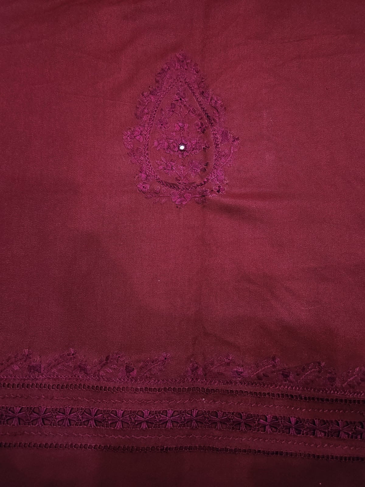 • Shirt: Hand-embroidered front with mirror detailing, plain or lightly designed back, and embroidered sleeves.