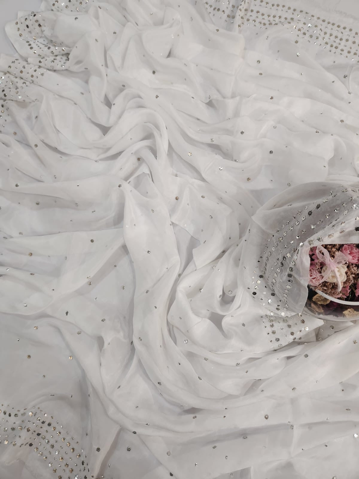 Crafted from pure medium silk, longer than usual (~3 meters) for that graceful, royal fall and adorned with fine mukesh work, made with the thinnest metallic threads ✨