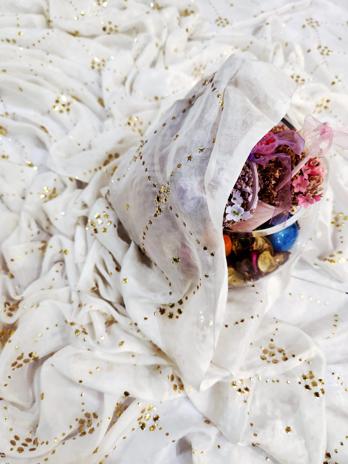 Crafted from pure medium silk, longer than usual (~3 meters) for that graceful, royal fall and adorned with fine mukesh work, made with the thinnest metallic threads ✨