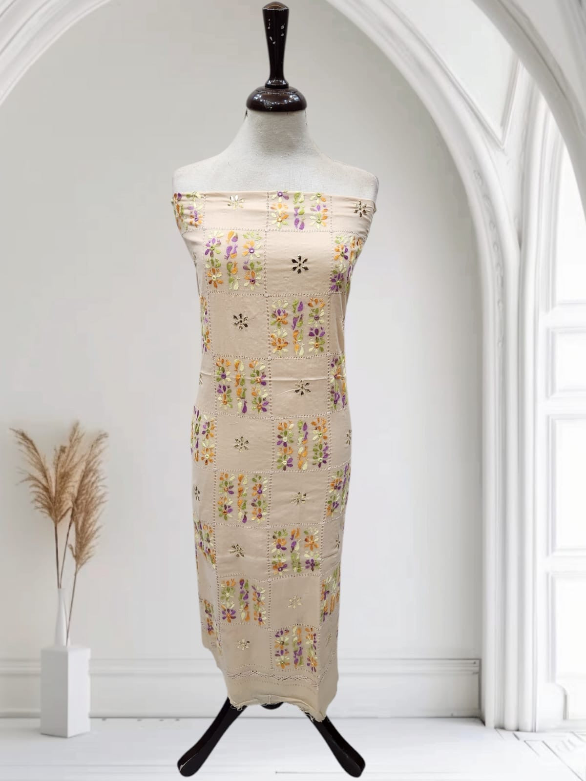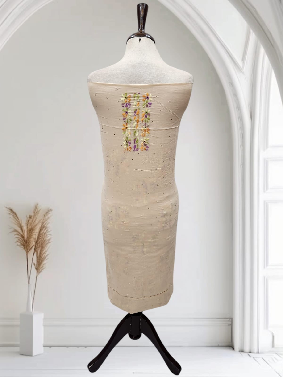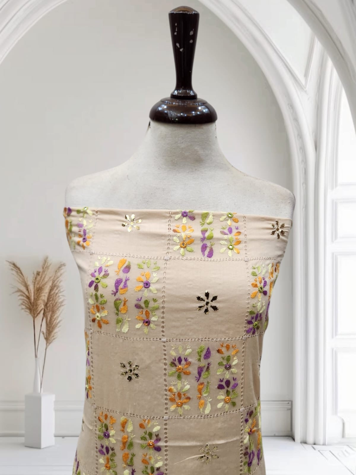 باریک tarkashi کے نقش آہستہ آہستہ اُبھرتے جا رہے تھے، ننھے پھول 🌼 ایک ایک کر کے کھل رہے تھے، آئینوں کی ہلکی سی چمک ✨ اور موتیوں کا کومل لمس کپڑے کو جیسے زندہ بنا رہے تھے۔