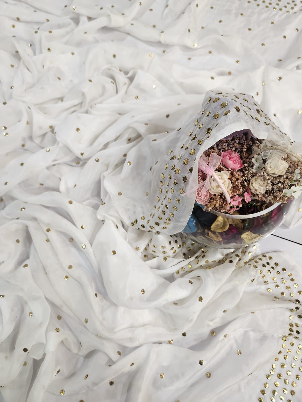 Crafted from pure medium silk, longer than usual (~3 meters) for that graceful, royal fall and adorned with fine mukesh work, made with the thinnest metallic threads ✨